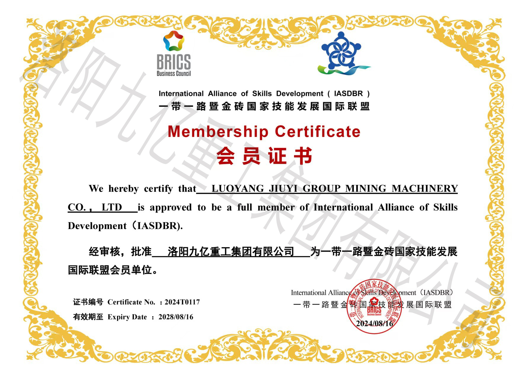 一帶一路暨金磚國家技能發展國際聯盟會員證書